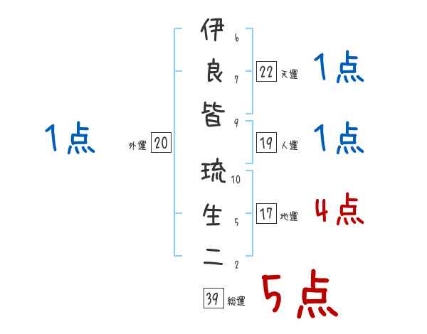 総運![]() | 伊良皆琉生二さんの総運は39画の5つ星!社交性に優れ人望が厚い。人の上に立ち成功する。 あなたの人生を表す1番重要な運勢です。生涯を通じて影響する総合運となり、主に50歳以降の晩年期に影響を及ぼします。 |