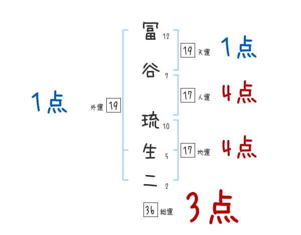 天運![]() | 冨谷琉生二さんの天運は19画の1つ星!優れた才能を持ちますが、協調性が足りないことも。周りの人と協力する事を意識しましょう。 家系が持つ宿命的な運勢を表します。祖先から受け継いだ苗字ですので自分の力が及びません。家柄を象徴します。 |