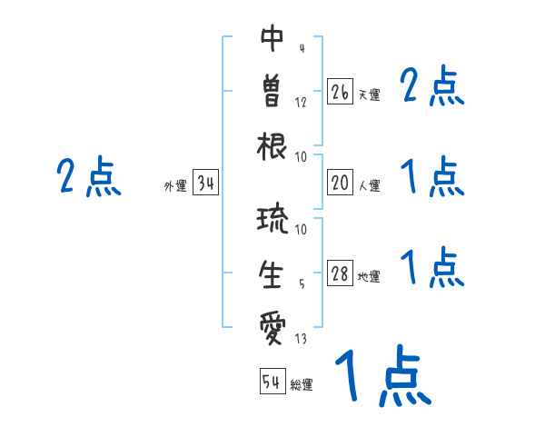 総運![]() | 中曽根琉生愛さんの総運は54画の1つ星!トラブルが多いかも。周りをよく見て協調して過ごしましょう。 あなたの人生を表す1番重要な運勢です。生涯を通じて影響する総合運となり、主に50歳以降の晩年期に影響を及ぼします。 |