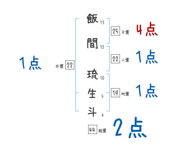 外運![]() | 飯間琉生斗さんの外運は22画の1つ星!努力することが苦手ないっぽう手先が器用。芸術性にも優れる。 生活面を象徴する運勢です。外部から受ける影響力を表し、結婚運、家庭運や職場、環境への順応性を表します。 |