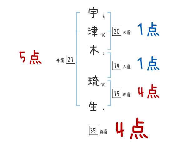 外運![]() | 宇津木琉生さんの外運は21画の5つ星!統率力がある。独立し成功する。名誉を手に入れる。 生活面を象徴する運勢です。外部から受ける影響力を表し、結婚運、家庭運や職場、環境への順応性を表します。 |