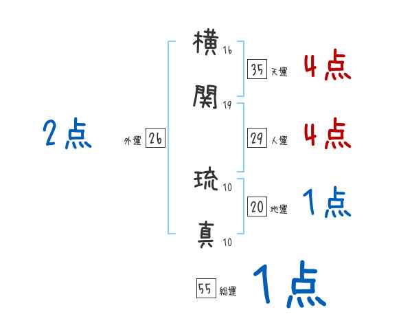 外運![]() | 横関琉真さんの外運は26画の2つ星!波瀾万丈かも。信頼できる人を大事にしましょう。 生活面を象徴する運勢です。外部から受ける影響力を表し、結婚運、家庭運や職場、環境への順応性を表します。 |
