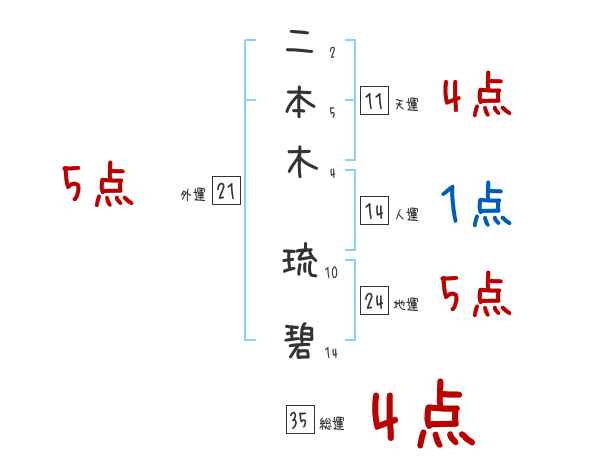 天運![]() | 二本木琉碧さんの天運は11画の4つ星!着実に富や地位を得る幸運な人生。 家系が持つ宿命的な運勢を表します。祖先から受け継いだ苗字ですので自分の力が及びません。家柄を象徴します。 |