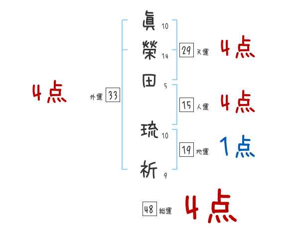 天運![]() | 眞榮田琉祈さんの天運は29画の4つ星!完全主義で才能がある。厳格な心の持ち主。 家系が持つ宿命的な運勢を表します。祖先から受け継いだ苗字ですので自分の力が及びません。家柄を象徴します。 |