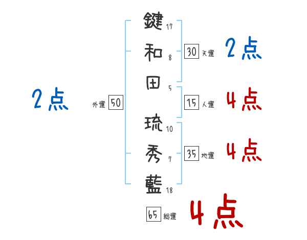 総運![]() | 鍵和田琉秀藍さんの総運は65画の4つ星!幸運に恵まれ繁栄する。包容力がある。 あなたの人生を表す1番重要な運勢です。生涯を通じて影響する総合運となり、主に50歳以降の晩年期に影響を及ぼします。 |