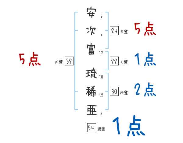外運![]() | 安次富琉稀亜さんの外運は32画の5つ星!柔軟性があり成功する。チャンスが多く金運が良い。 生活面を象徴する運勢です。外部から受ける影響力を表し、結婚運、家庭運や職場、環境への順応性を表します。 |