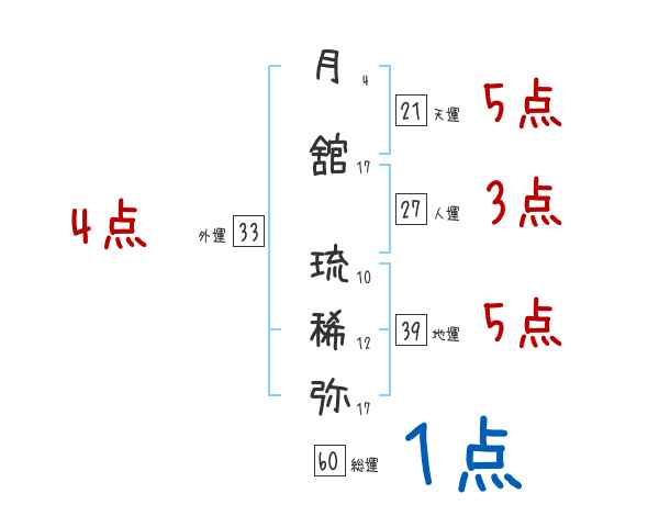 天運![]() | 月舘琉稀弥さんの天運は21画の5つ星!統率力がある。独立し成功する。名誉を手に入れる。 家系が持つ宿命的な運勢を表します。祖先から受け継いだ苗字ですので自分の力が及びません。家柄を象徴します。 |