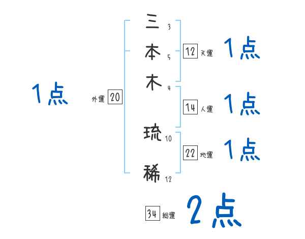 総運![]() | 三本木琉稀さんの総運は34画の2つ星!独創性に優れるが、自尊心が強く災難に注意しましょう。 あなたの人生を表す1番重要な運勢です。生涯を通じて影響する総合運となり、主に50歳以降の晩年期に影響を及ぼします。 |