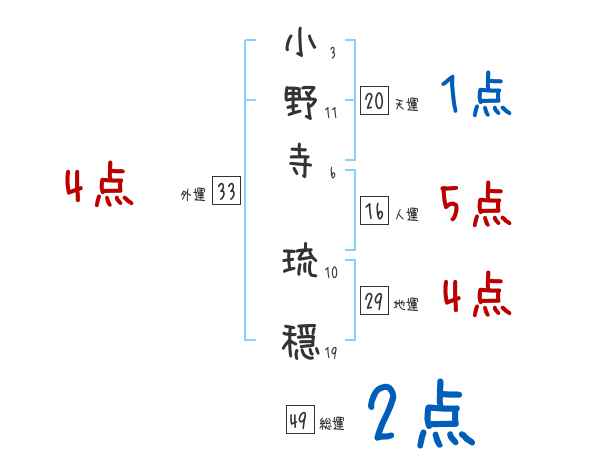 外運![]() | 小野寺琉穏さんの外運は33画の4つ星!権力志向でプライドが高い。勇気があり運を切り開き成功する。 生活面を象徴する運勢です。外部から受ける影響力を表し、結婚運、家庭運や職場、環境への順応性を表します。 |