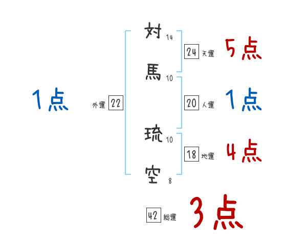 総運![]() | 対馬琉空さんの総運は42画の3つ星!病気に注意。多芸であるが消極的でおとなしい。 あなたの人生を表す1番重要な運勢です。生涯を通じて影響する総合運となり、主に50歳以降の晩年期に影響を及ぼします。 |