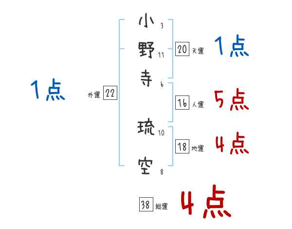 人運![]() | 小野寺琉空さんの人運は16画の5つ星!人望が厚く大きく発展する。逆転成功が見える。 性格や才能などを表す2番目に重要な運勢です。人間関係や協調性、社会的な成功に影響します。主に20歳から50歳ぐらいまでの中年期の運勢を表します。 |