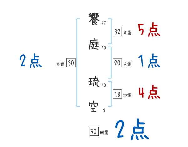 天運![]() | 饗庭琉空さんの天運は32画の5つ星!柔軟性があり成功する。チャンスが多く金運が良い。 家系が持つ宿命的な運勢を表します。祖先から受け継いだ苗字ですので自分の力が及びません。家柄を象徴します。 |