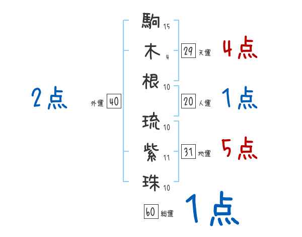 天運![]() | 駒木根琉紫珠さんの天運は29画の4つ星!完全主義で才能がある。厳格な心の持ち主。 家系が持つ宿命的な運勢を表します。祖先から受け継いだ苗字ですので自分の力が及びません。家柄を象徴します。 |