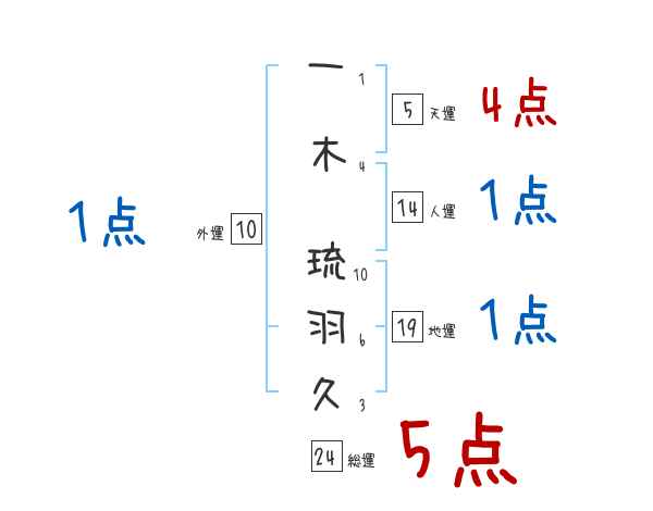 天運![]() | 一木琉羽久さんの天運は5画の4つ星!健康で安泰。協調性に優れ、財産に恵まれる。 家系が持つ宿命的な運勢を表します。祖先から受け継いだ苗字ですので自分の力が及びません。家柄を象徴します。 |