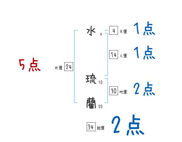 外運![]() | 水琉藺さんの外運は24画の5つ星!家庭運が良く順調な人生。金運にも恵まれる。 生活面を象徴する運勢です。外部から受ける影響力を表し、結婚運、家庭運や職場、環境への順応性を表します。 |