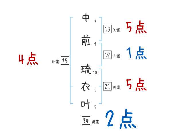 天運![]() | 中前琉衣叶さんの天運は13画の5つ星!才能に恵まれ人気がある。名声を手に入れる。円満な人生。 家系が持つ宿命的な運勢を表します。祖先から受け継いだ苗字ですので自分の力が及びません。家柄を象徴します。 |