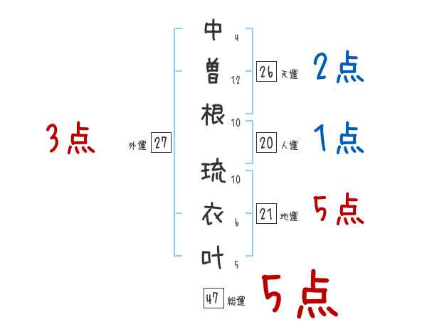 総運![]()  | 中曽根琉衣叶さんの総運は47画の5つ星!実力が開花し発展する円満な人生。財に恵まれる。 あなたの人生を表す1番重要な運勢です。生涯を通じて影響する総合運となり、主に50歳以降の晩年期に影響を及ぼします。 |