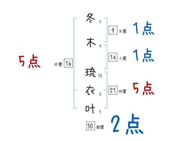 天運![]() | 冬木琉衣叶さんの天運は9画の1つ星!消極的で才能を発揮することが苦手なことも。周りの意見に耳を傾けましょう。 家系が持つ宿命的な運勢を表します。祖先から受け継いだ苗字ですので自分の力が及びません。家柄を象徴します。 |