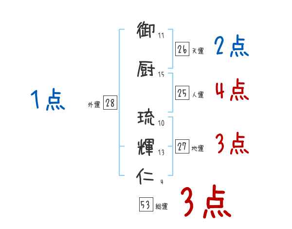 総運![]() | 御厨琉輝仁さんの総運は53画の3つ星!やや見栄っ張りで虚栄心がある。散財に注意。 あなたの人生を表す1番重要な運勢です。生涯を通じて影響する総合運となり、主に50歳以降の晩年期に影響を及ぼします。 |