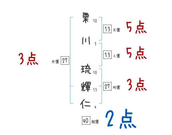 天運![]() | 栗川琉輝仁さんの天運は13画の5つ星!才能に恵まれ人気がある。名声を手に入れる。円満な人生。 家系が持つ宿命的な運勢を表します。祖先から受け継いだ苗字ですので自分の力が及びません。家柄を象徴します。 |