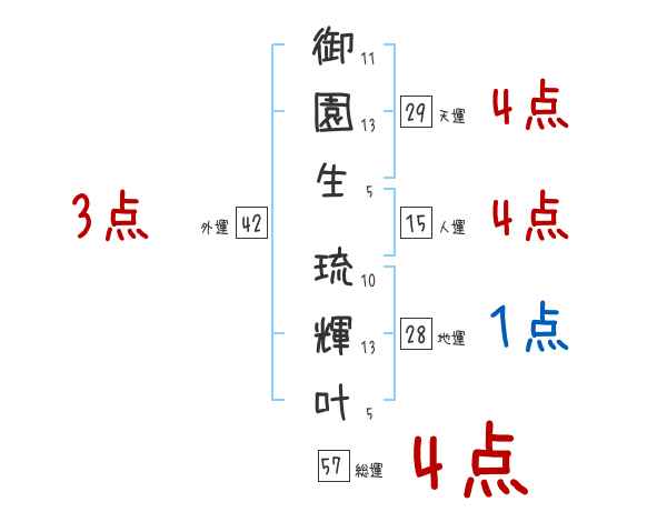 総運![]() | 御園生琉輝叶さんの総運は57画の4つ星!向上心があり人望がある。地位を得る。 あなたの人生を表す1番重要な運勢です。生涯を通じて影響する総合運となり、主に50歳以降の晩年期に影響を及ぼします。 |