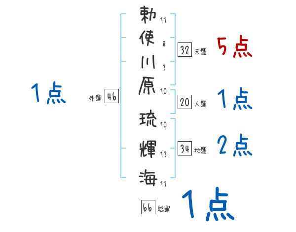 天運![]() | 勅使川原琉輝海さんの天運は32画の5つ星!柔軟性があり成功する。チャンスが多く金運が良い。 家系が持つ宿命的な運勢を表します。祖先から受け継いだ苗字ですので自分の力が及びません。家柄を象徴します。 |