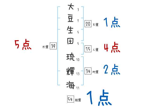 外運![]() | 大豆生田琉輝海さんの外運は39画の5つ星!社交性に優れ人望が厚い。人の上に立ち成功する。 生活面を象徴する運勢です。外部から受ける影響力を表し、結婚運、家庭運や職場、環境への順応性を表します。 |