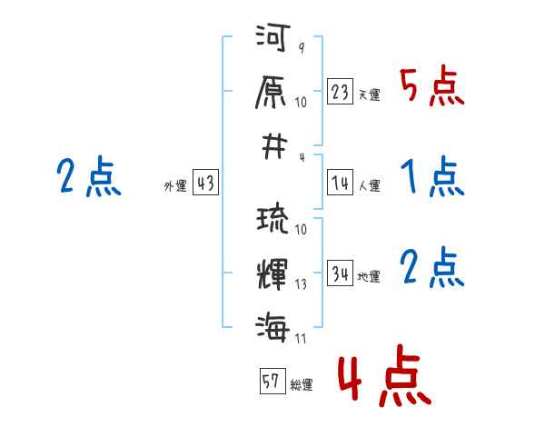 天運![]() | 河原井琉輝海さんの天運は23画の5つ星!想像力に優れ活力がある。一代で成功し名誉を手に入れる。 家系が持つ宿命的な運勢を表します。祖先から受け継いだ苗字ですので自分の力が及びません。家柄を象徴します。 |