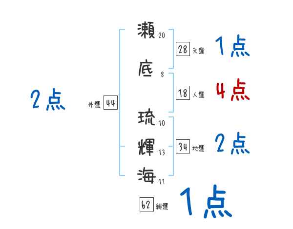 天運![]() | 瀬底琉輝海さんの天運は28画の1つ星!家庭環境に注意。スポーツで活躍できる能力があるかも。 家系が持つ宿命的な運勢を表します。祖先から受け継いだ苗字ですので自分の力が及びません。家柄を象徴します。 |
