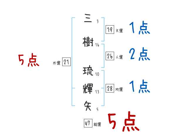 外運![]() | 三樹琉輝矢さんの外運は21画の5つ星!統率力がある。独立し成功する。名誉を手に入れる。 生活面を象徴する運勢です。外部から受ける影響力を表し、結婚運、家庭運や職場、環境への順応性を表します。 |
