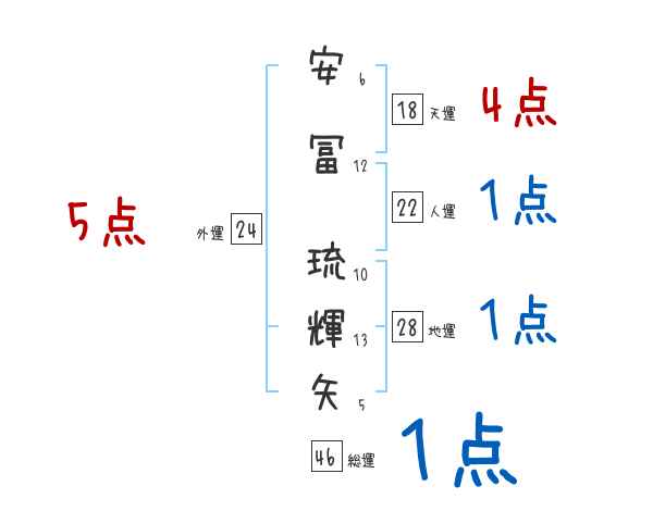 天運![]() | 安冨琉輝矢さんの天運は18画の4つ星!情熱的で剛気。忍耐力があり信頼される。 家系が持つ宿命的な運勢を表します。祖先から受け継いだ苗字ですので自分の力が及びません。家柄を象徴します。 |