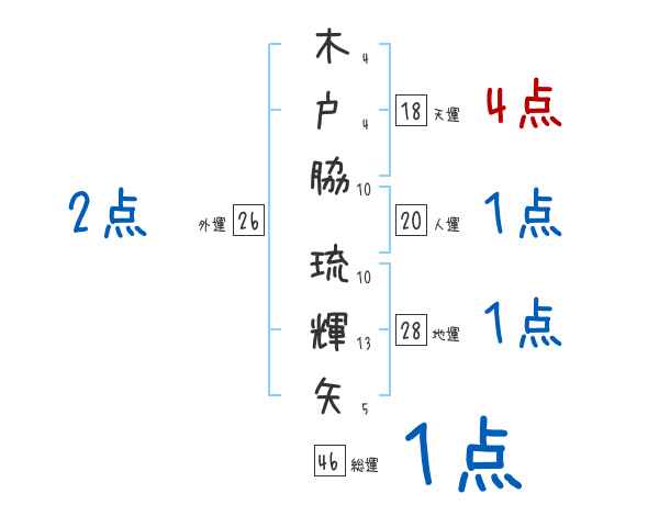 天運![]() | 木戸脇琉輝矢さんの天運は18画の4つ星!情熱的で剛気。忍耐力があり信頼される。 家系が持つ宿命的な運勢を表します。祖先から受け継いだ苗字ですので自分の力が及びません。家柄を象徴します。 |