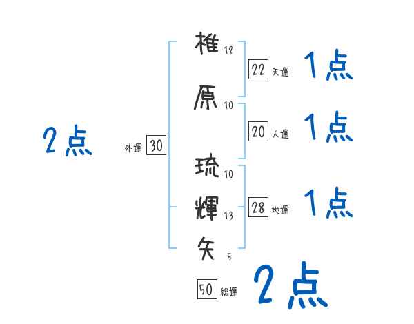 天運![]() | 椎原琉輝矢さんの天運は22画の1つ星!努力することが苦手ないっぽう手先が器用。芸術性にも優れる。 家系が持つ宿命的な運勢を表します。祖先から受け継いだ苗字ですので自分の力が及びません。家柄を象徴します。 |