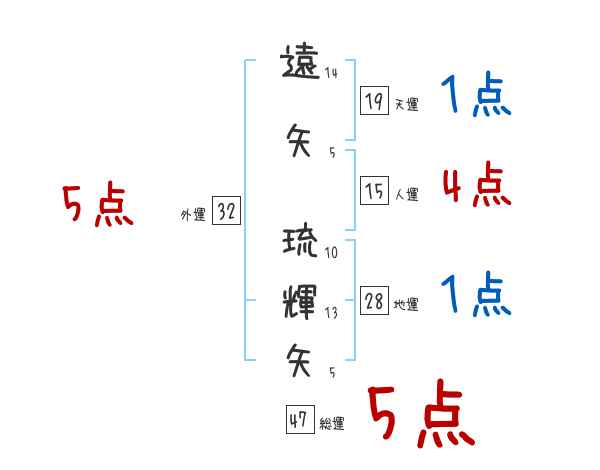 外運![]() | 遠矢琉輝矢さんの外運は32画の5つ星!柔軟性があり成功する。チャンスが多く金運が良い。 生活面を象徴する運勢です。外部から受ける影響力を表し、結婚運、家庭運や職場、環境への順応性を表します。 |