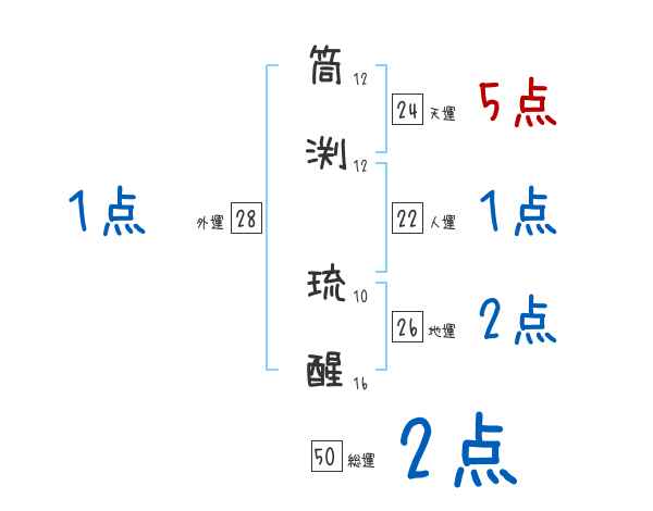 天運![]() | 筒渕琉醒さんの天運は24画の5つ星!家庭運が良く順調な人生。金運にも恵まれる。 家系が持つ宿命的な運勢を表します。祖先から受け継いだ苗字ですので自分の力が及びません。家柄を象徴します。 |