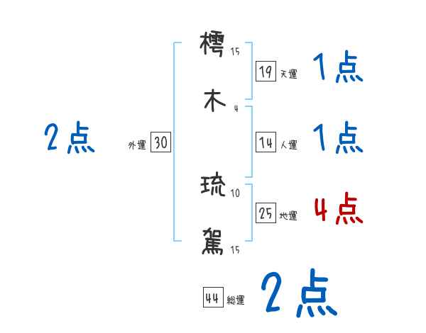 総運![]() | 樗木琉駕さんの総運は44画の2つ星!誠実で慎重な性格。物事を考えすぎないように注意しましょう。 あなたの人生を表す1番重要な運勢です。生涯を通じて影響する総合運となり、主に50歳以降の晩年期に影響を及ぼします。 |