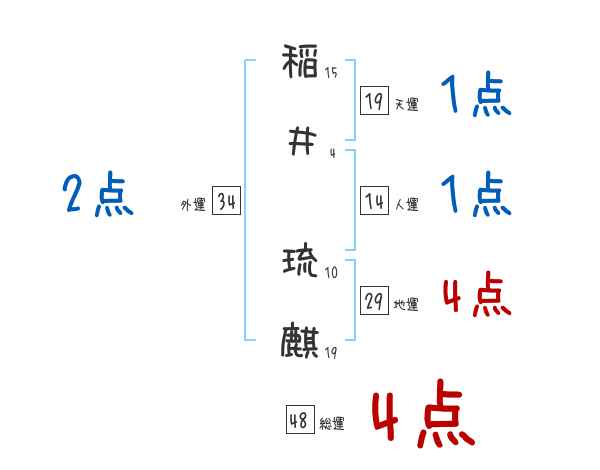 外運![]() | 稲井琉麒さんの外運は34画の2つ星!独創性に優れるが、自尊心が強く災難に注意しましょう。 生活面を象徴する運勢です。外部から受ける影響力を表し、結婚運、家庭運や職場、環境への順応性を表します。 |