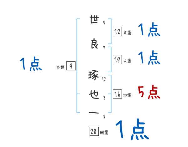 人運![]() | 世良琢也一さんの人運は19画の1つ星!優れた才能を持ちますが、協調性が足りないことも。周りの人と協力する事を意識しましょう。 性格や才能などを表す2番目に重要な運勢です。人間関係や協調性、社会的な成功に影響します。主に20歳から50歳ぐらいまでの中年期の運勢を表します。 |