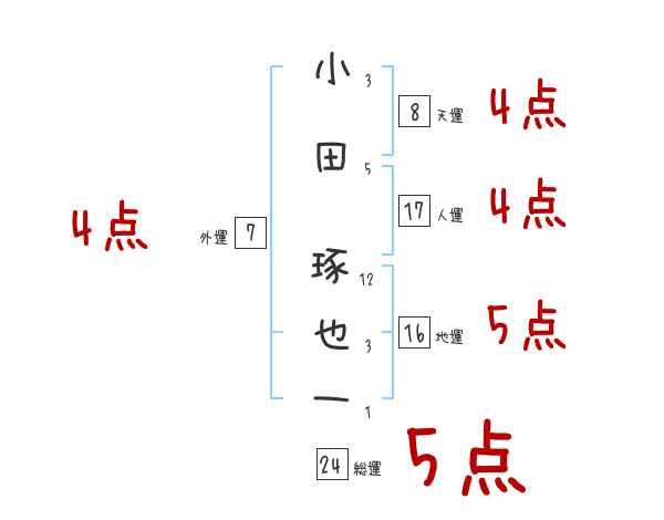 総運![]() | 小田琢也一さんの総運は24画の5つ星!家庭運が良く順調な人生。金運にも恵まれる。 あなたの人生を表す1番重要な運勢です。生涯を通じて影響する総合運となり、主に50歳以降の晩年期に影響を及ぼします。 |