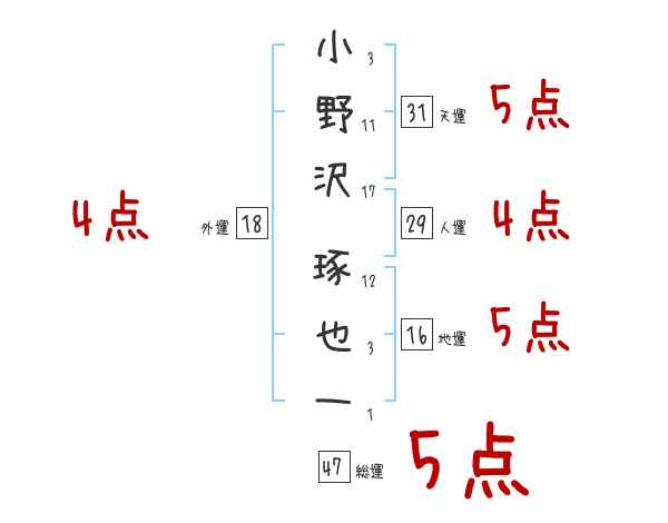 総運![]() | 小野沢琢也一さんの総運は47画の5つ星!実力が開花し発展する円満な人生。財に恵まれる。 あなたの人生を表す1番重要な運勢です。生涯を通じて影響する総合運となり、主に50歳以降の晩年期に影響を及ぼします。 |