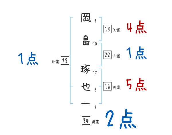 総運![]() | 岡畠琢也一さんの総運は34画の2つ星!独創性に優れるが、自尊心が強く災難に注意しましょう。 あなたの人生を表す1番重要な運勢です。生涯を通じて影響する総合運となり、主に50歳以降の晩年期に影響を及ぼします。 |