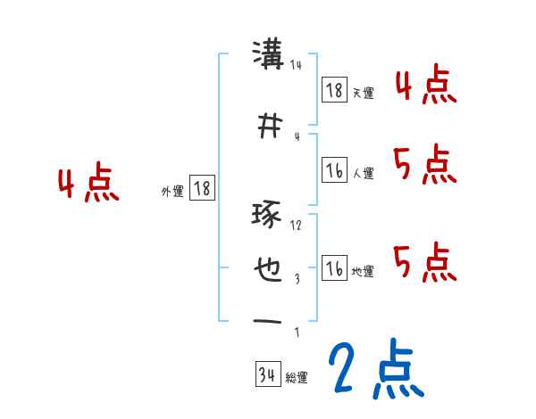 総運![]() | 溝井琢也一さんの総運は34画の2つ星!独創性に優れるが、自尊心が強く災難に注意しましょう。 あなたの人生を表す1番重要な運勢です。生涯を通じて影響する総合運となり、主に50歳以降の晩年期に影響を及ぼします。 |
