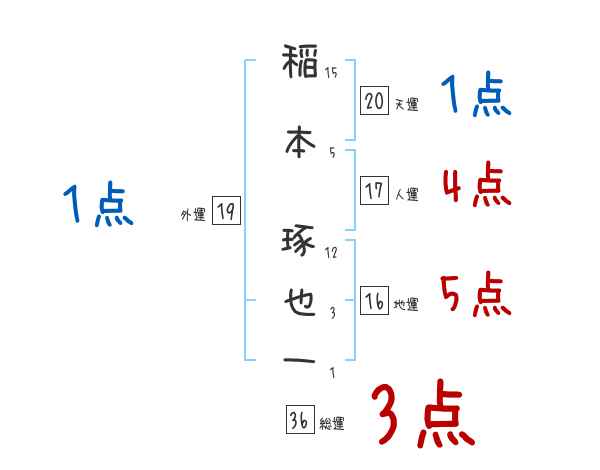 | 天運  | 稲本琢也一さんの天運は20画の1つ星!社交が苦手。人とは違った才能があり波乱万丈な人生かも。家系が持つ宿命的な運勢を表します。祖先から受け継いだ苗字ですので自分の力が及びません。家柄を象徴します。 |