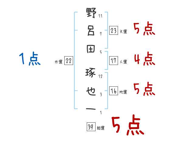 天運![]() | 野呂田琢也一さんの天運は23画の5つ星!想像力に優れ活力がある。一代で成功し名誉を手に入れる。 家系が持つ宿命的な運勢を表します。祖先から受け継いだ苗字ですので自分の力が及びません。家柄を象徴します。 |
