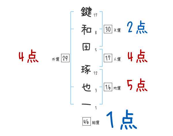 天運![]() | 鍵和田琢也一さんの天運は30画の2つ星!浮き沈みの激しさに注意しましょう。 家系が持つ宿命的な運勢を表します。祖先から受け継いだ苗字ですので自分の力が及びません。家柄を象徴します。 |