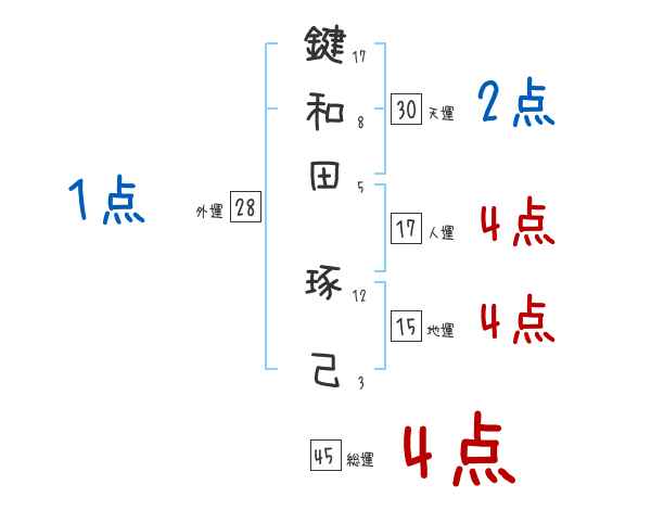 天運![]() | 鍵和田琢己さんの天運は30画の2つ星!浮き沈みの激しさに注意しましょう。 家系が持つ宿命的な運勢を表します。祖先から受け継いだ苗字ですので自分の力が及びません。家柄を象徴します。 |