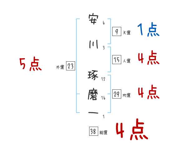 外運![]() | 安川琢磨一さんの外運は23画の5つ星!想像力に優れ活力がある。一代で成功し名誉を手に入れる。 生活面を象徴する運勢です。外部から受ける影響力を表し、結婚運、家庭運や職場、環境への順応性を表します。 |