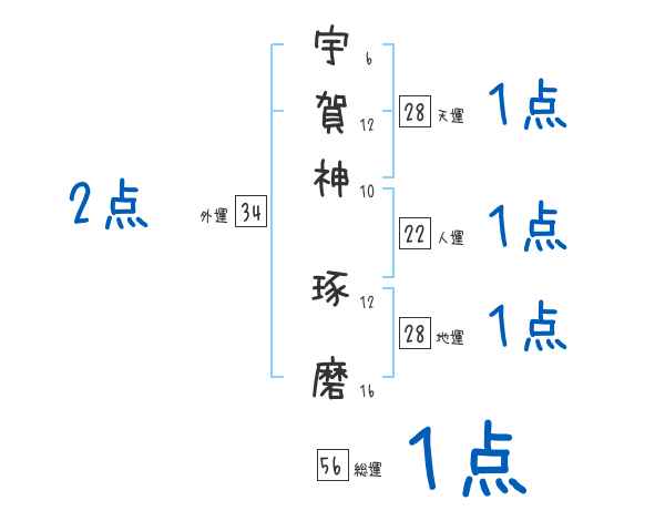 | 外運  | 宇賀神琢磨さんの外運は34画の2つ星!独創性に優れるが、自尊心が強く災難に注意しましょう。生活面を象徴する運勢です。外部から受ける影響力を表し、結婚運、家庭運や職場、環境への順応性を表します。 |