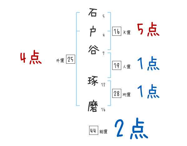 天運![]() | 石戸谷琢磨さんの天運は16画の5つ星!人望が厚く大きく発展する。逆転成功が見える。 家系が持つ宿命的な運勢を表します。祖先から受け継いだ苗字ですので自分の力が及びません。家柄を象徴します。 |