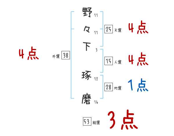 総運![]() | 野々下琢磨さんの総運は53画の3つ星!やや見栄っ張りで虚栄心がある。散財に注意。 あなたの人生を表す1番重要な運勢です。生涯を通じて影響する総合運となり、主に50歳以降の晩年期に影響を及ぼします。 |